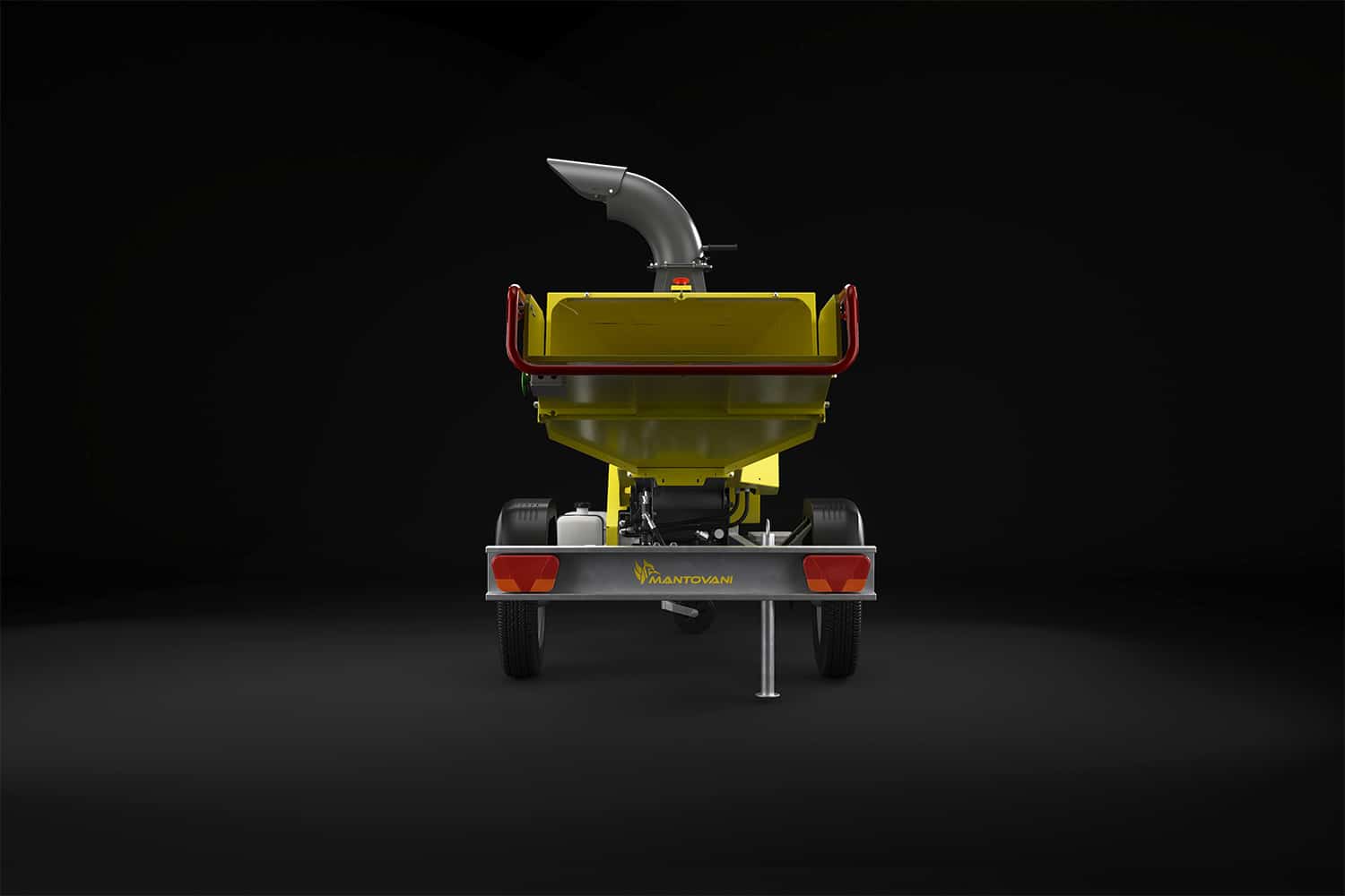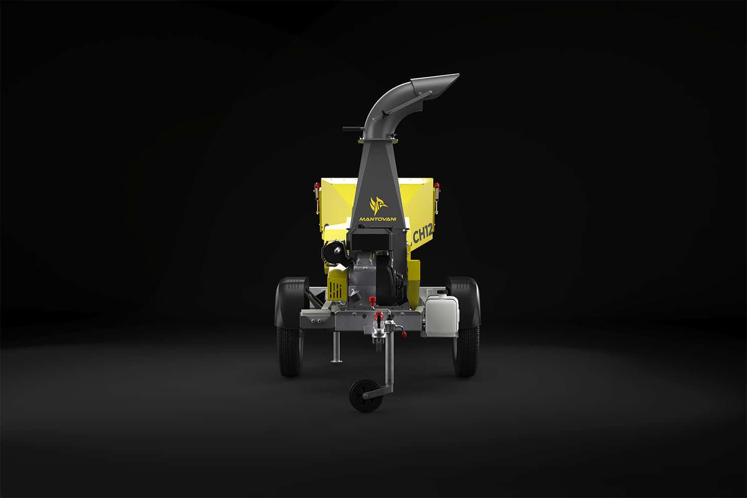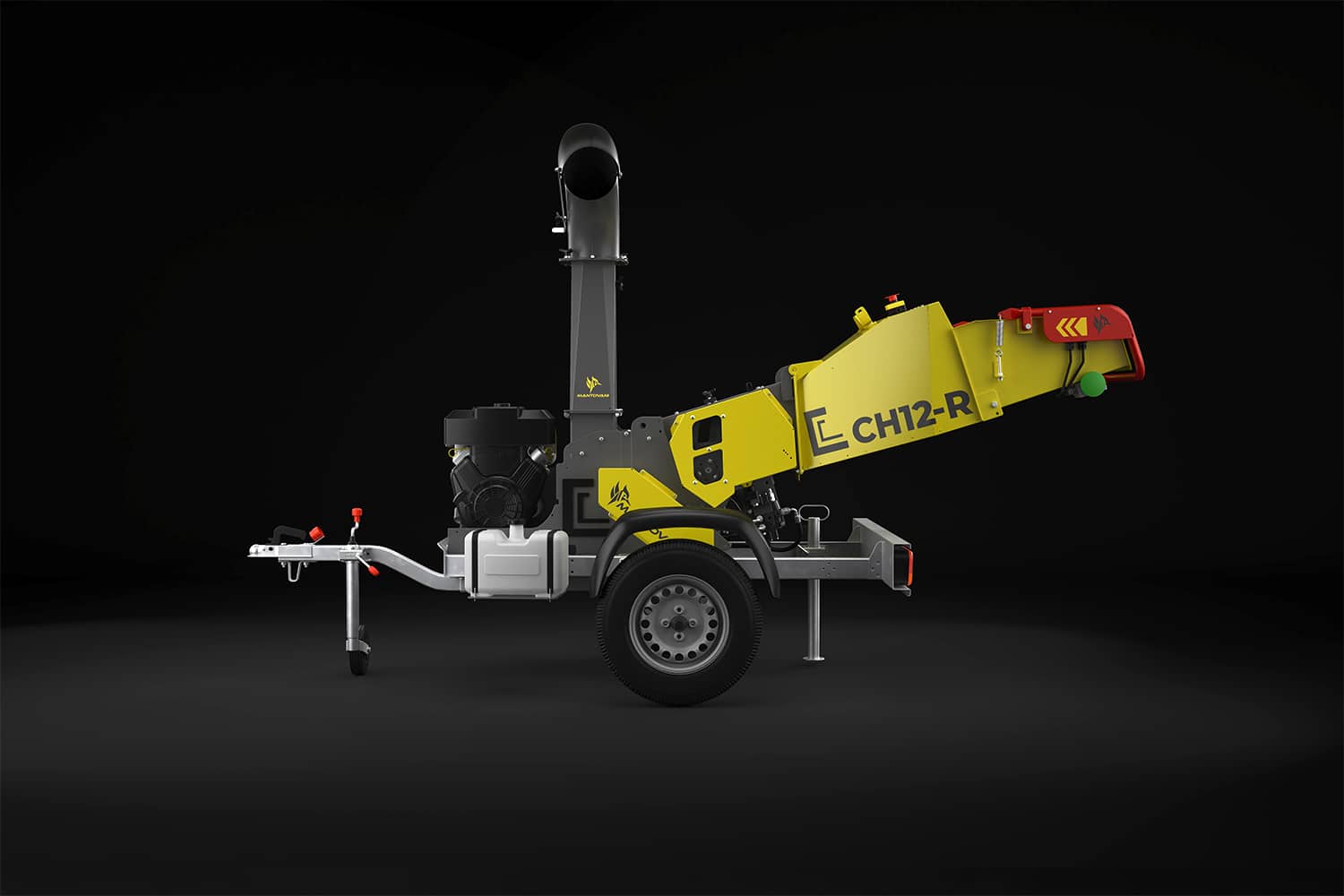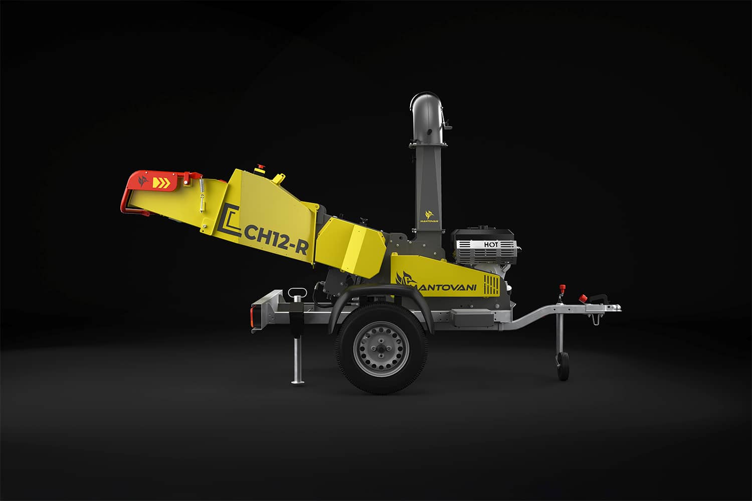 Biotrituratore a tamburo professionale su carrello stradale omologato per giardinaggio e agricoltura che può triturare qualsiasi tipo di residuo vegetale secco o umido fino ad un diametro di 12 cm. CH12-R offre la possibilità di entrare in aree agricole e/o boschive e di superare agevolmente le pendenze.